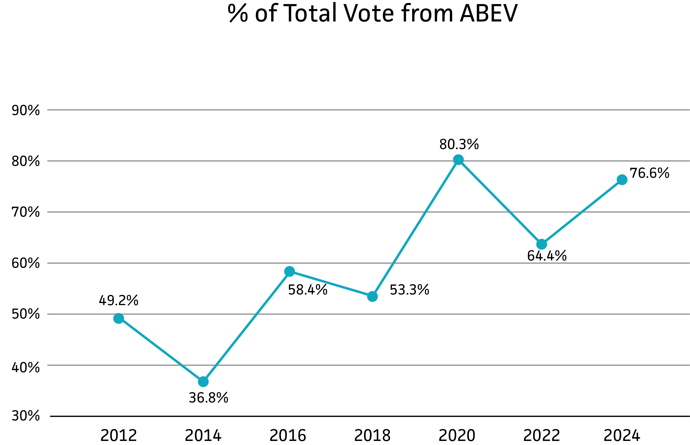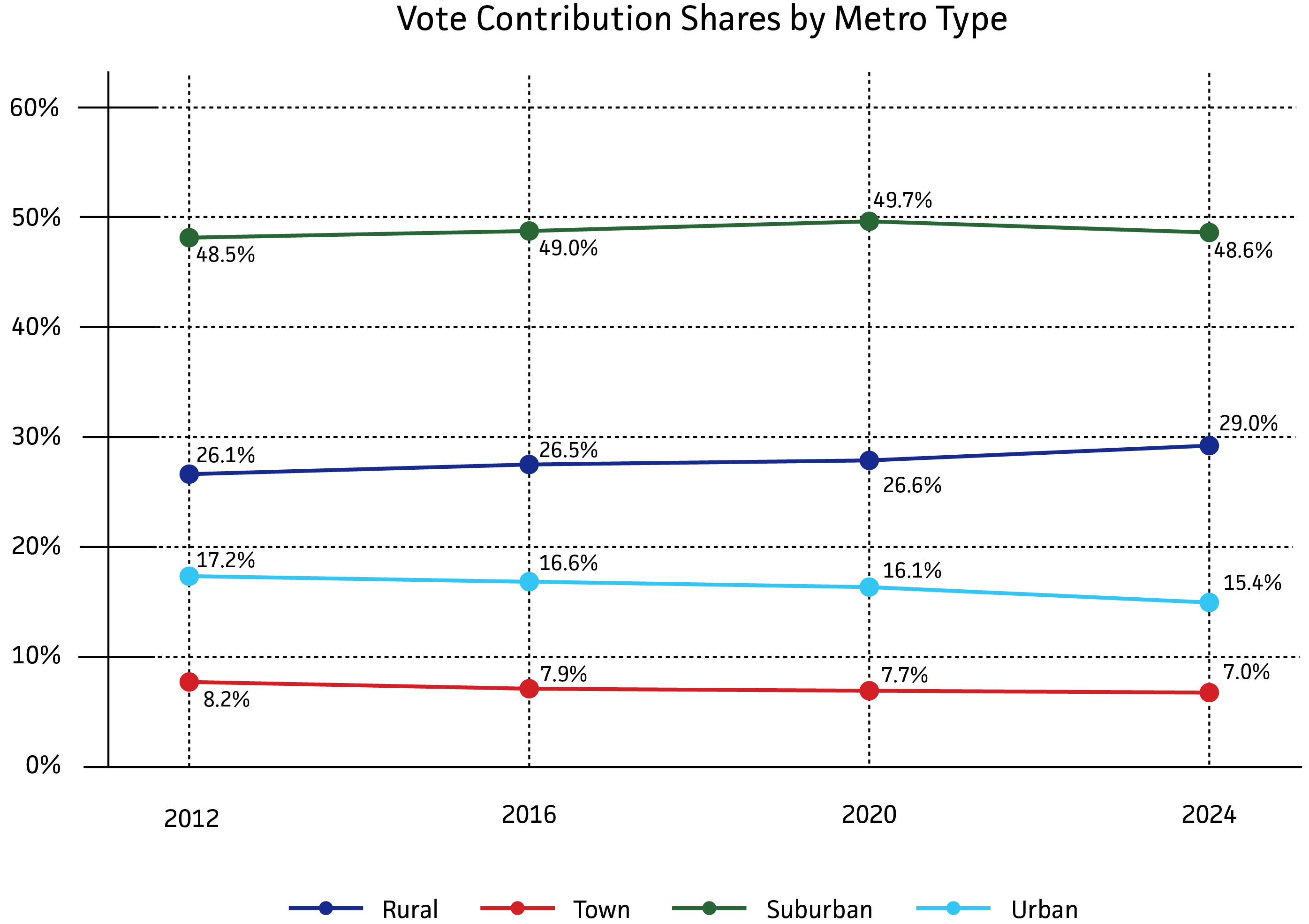 - Rural voters increased their share of the total vote by 2.4% in 2024, while suburban and urban voters decreased in their overall share of the vote.