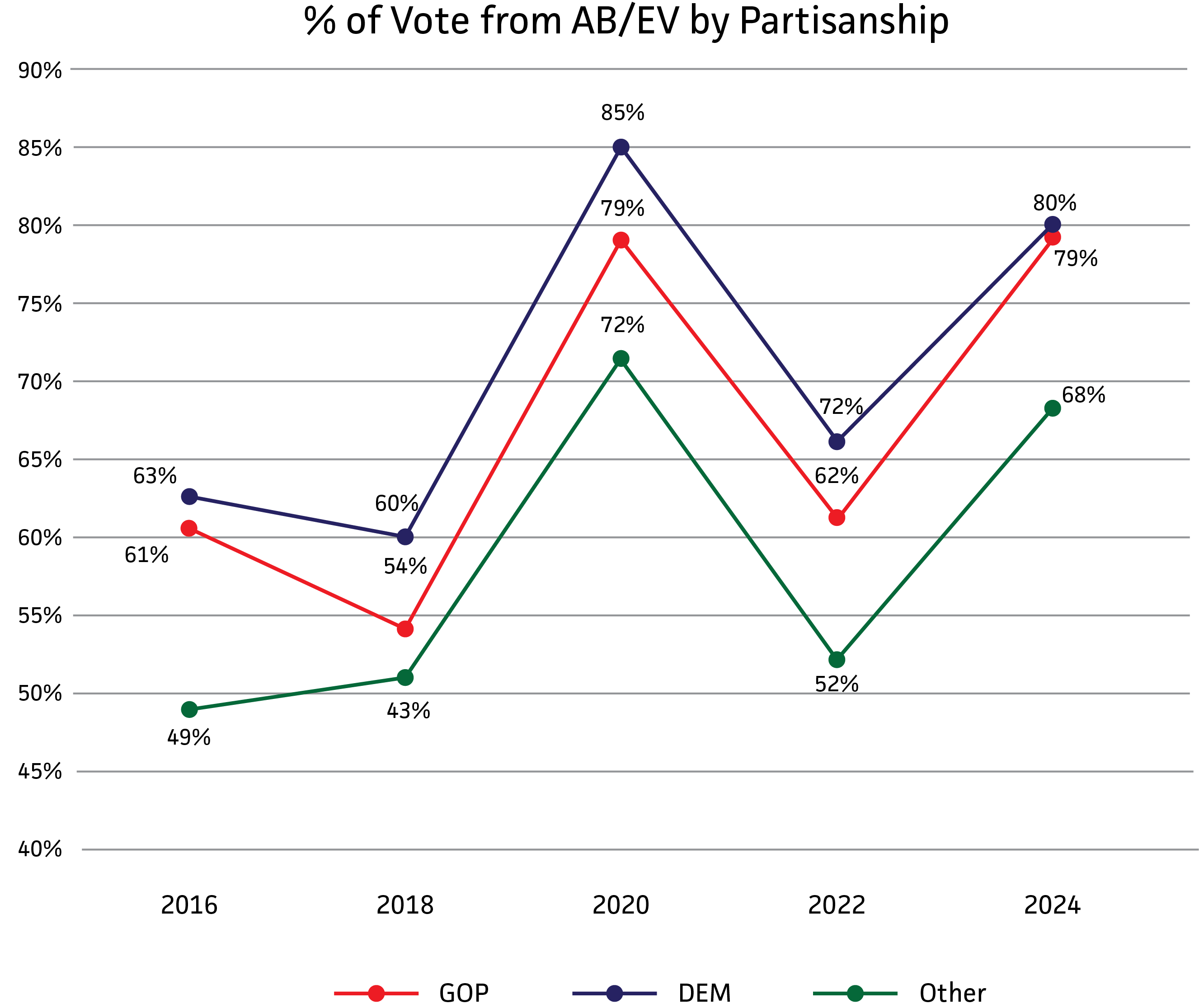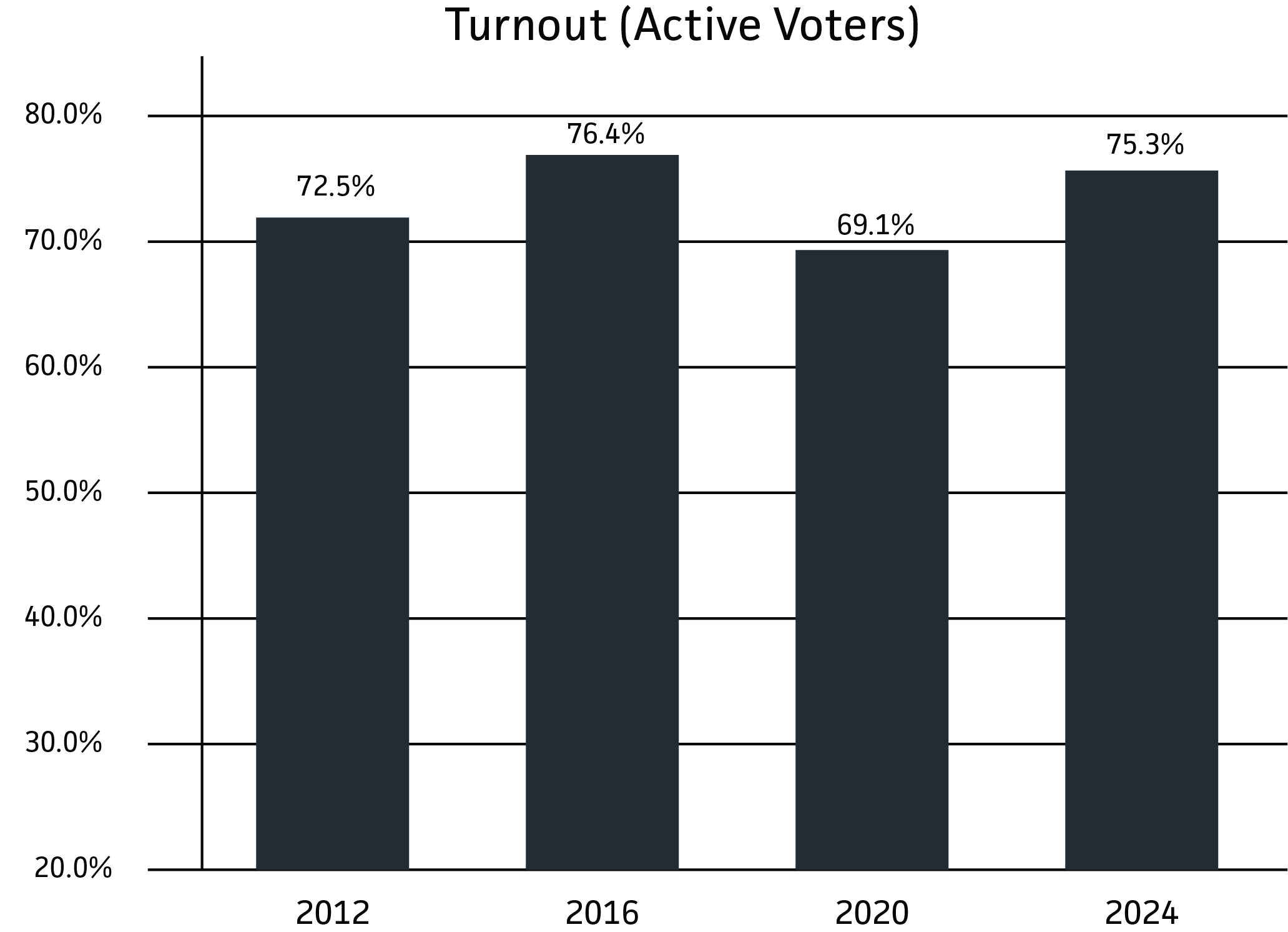 - Over 75% of votes were cast before Election Day, reflecting a slight decline from 2020.