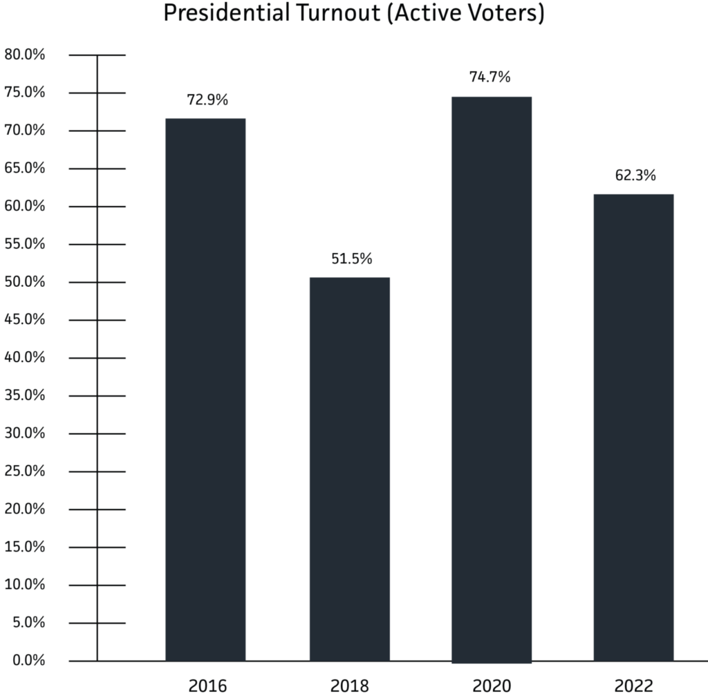 - Active voters have been showing a positive trend in turnout increasing in both the most recent Presidential (+1.8%) and off-cycle (+10.8%) elections.