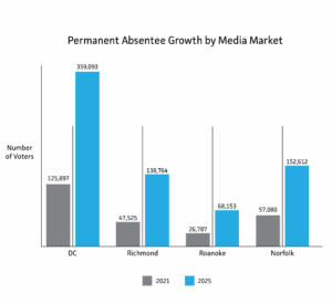 The largest increase in permanent absentee records is in the Washington DC media market, adding over a quarter-million requests. Outside DC, the largest increases are in Richmond, Norfolk, and Roanoke. Together, they add over 460,000 new permanent absentee voters, showing the raw permanent request totals remain concentrated in Virginia’s major urban and suburban markets.